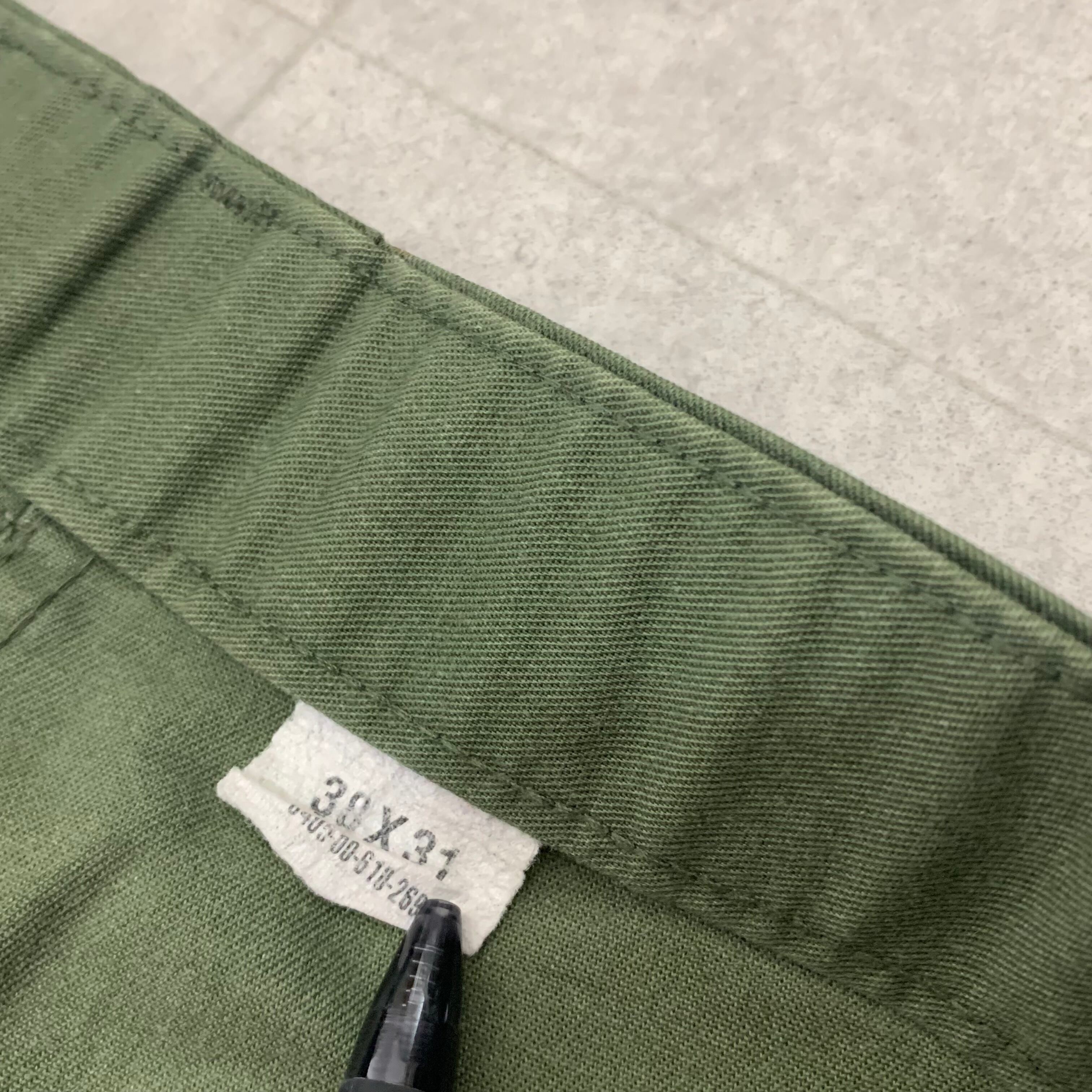 ●年代 85年度会計 ●サイズ表記 38×31 ウエスト 46センチ 渡り幅 37センチ 裾幅 22センチ 総丈 107センチ 股下 71センチ ●カラー オリーブ ●素材 コットン50% ポリエステル50% ●状態 目立つ汚れ等無し