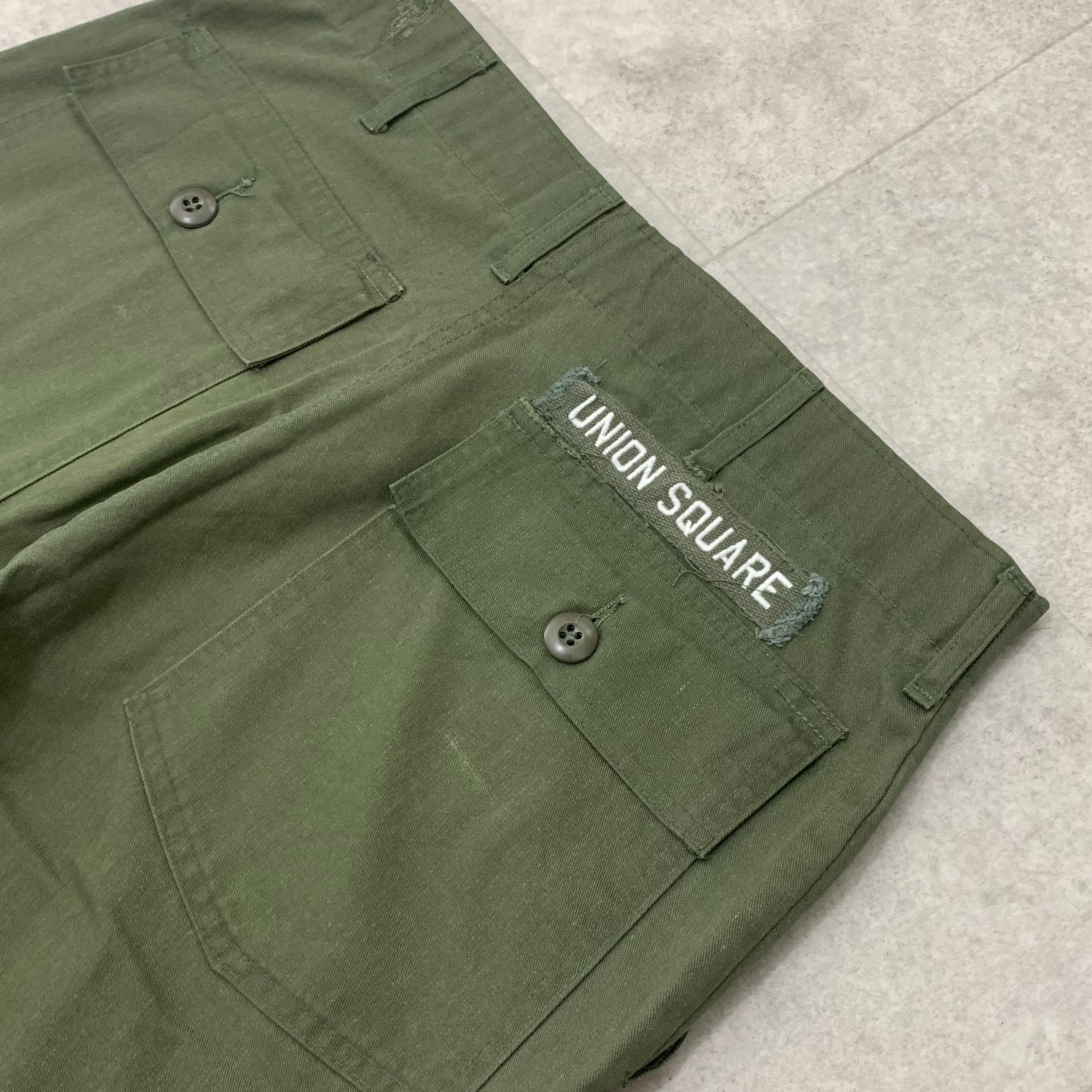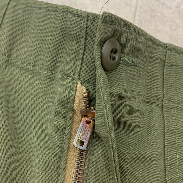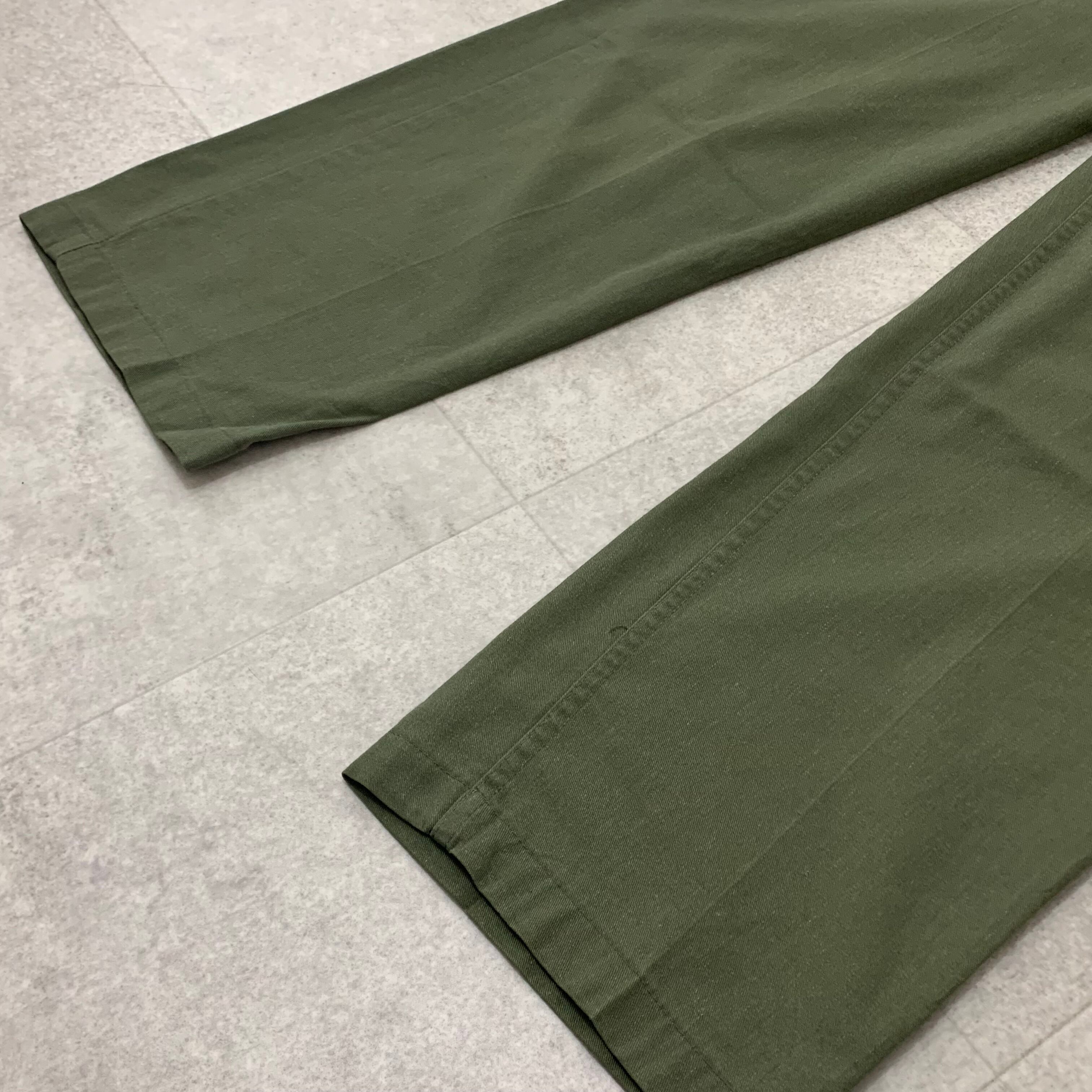 ●年代 79年度会計 ●サイズ表記 34×31 ウエスト 40センチ 渡り幅 33センチ 裾幅 21センチ 総丈 105センチ 股下 76センチ ●カラー オリーブ ●素材 コットン50% ポリエステル50% ●状態 リペア跡有り